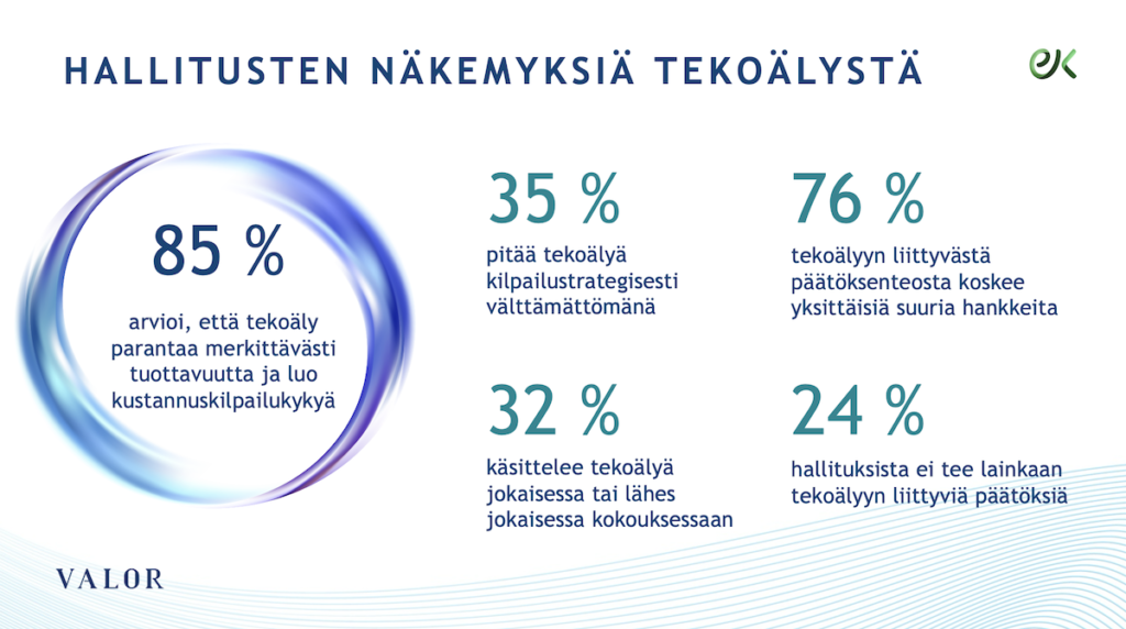 VALOR selvitti yhteistyössä Elinkeinoelämän keskusliitto EK:n kanssa suomalaisten suuryritysten hallitusten näkemyksiä tekoälystä. Valtaosa (85 %) haastatelluista näkee tekoälyn ensisijaisesti tuottavuuden ja tehokkuuden lähteenä, ei kasvun moottorina. Tekoälyn käsittelytavat hallituksissa vaihtelevat, ja osassa yrityksiä tekoäly on jo jatkuvasti hallituksen agendalla.